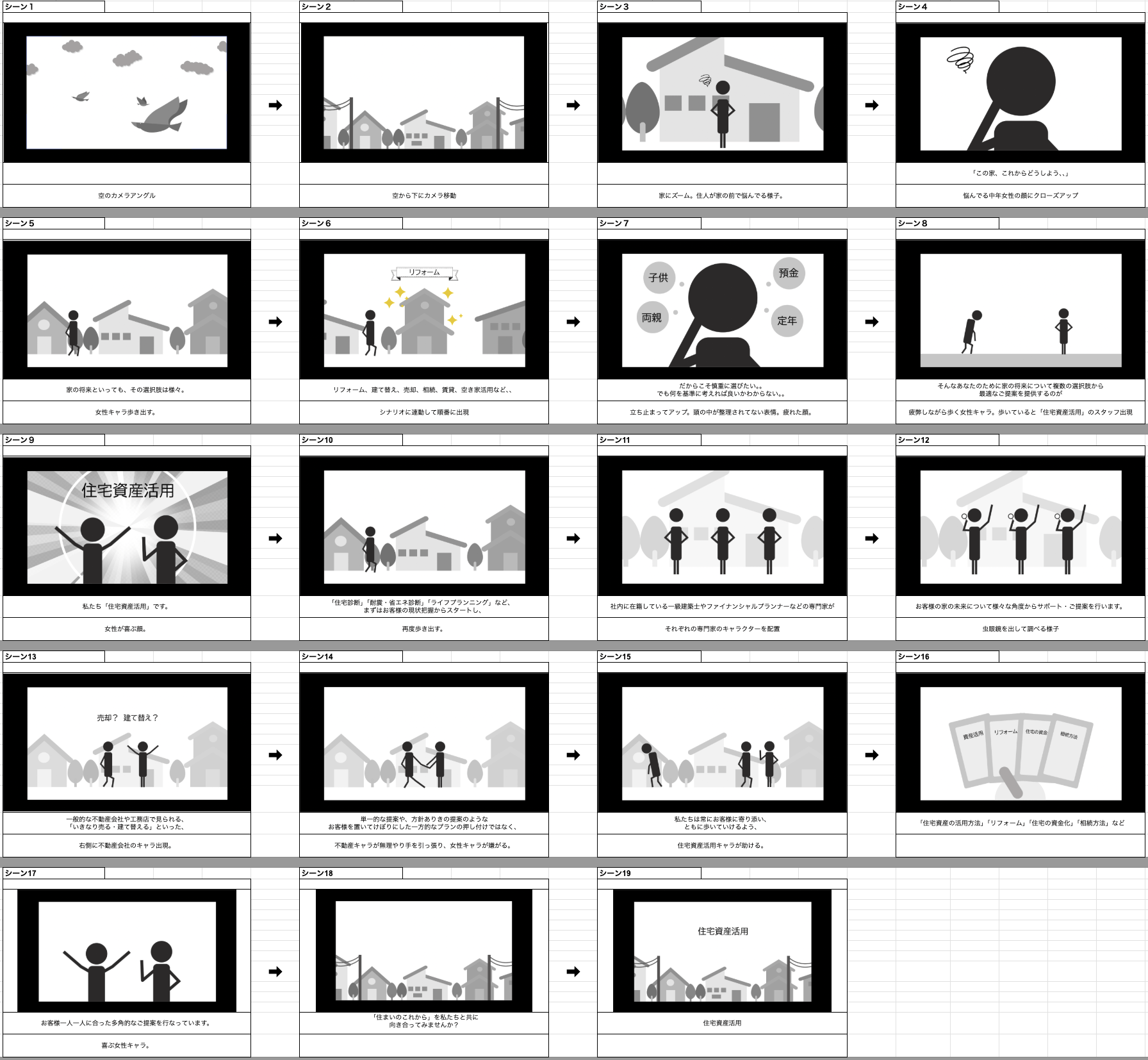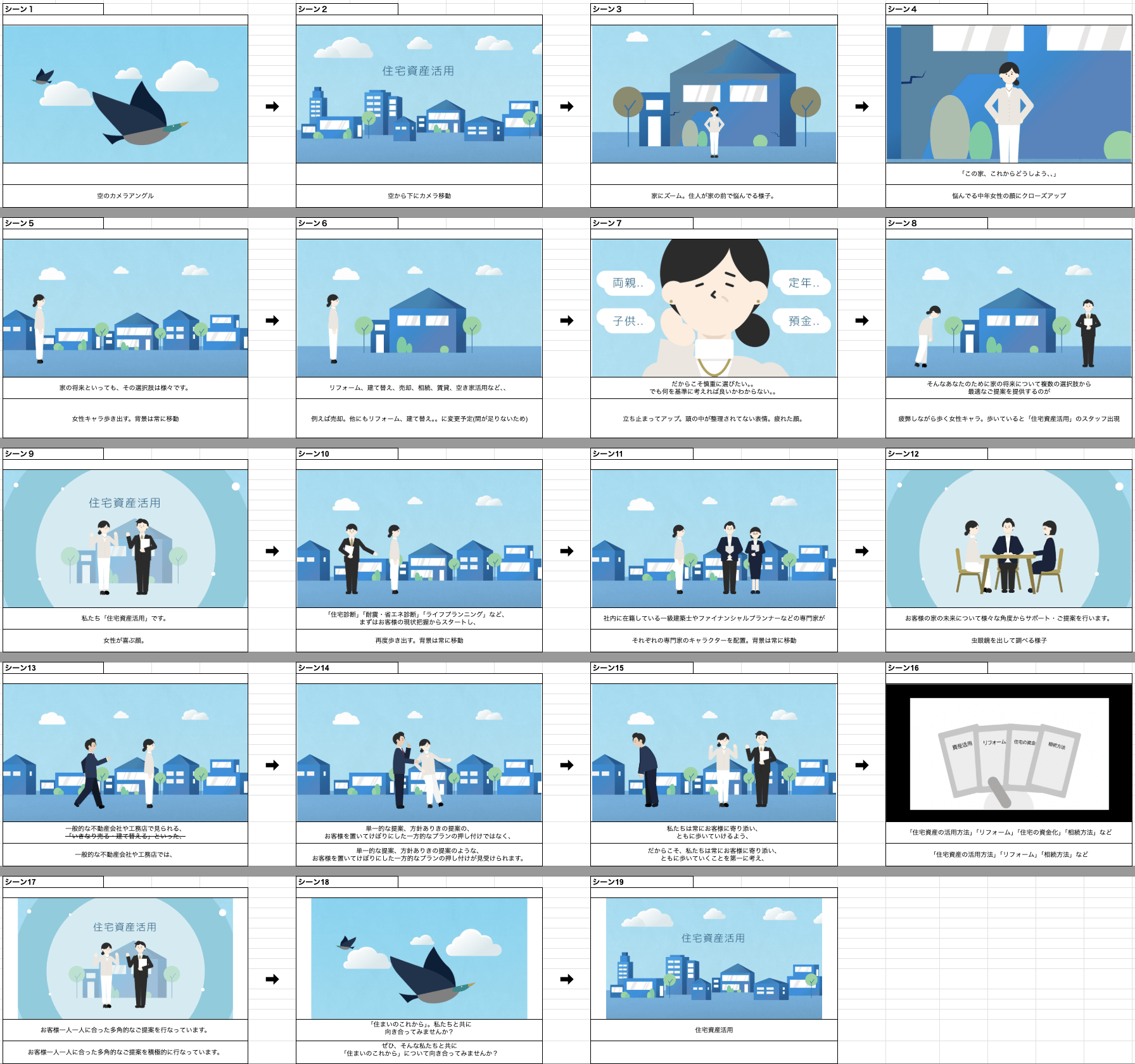 動画の構成・展開をご確認いただくストーリーボードを制作しました。